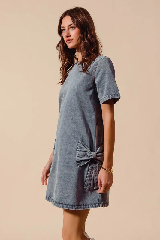 A Line Fit and Flare Diamond Bow Ribbon Denim Dres