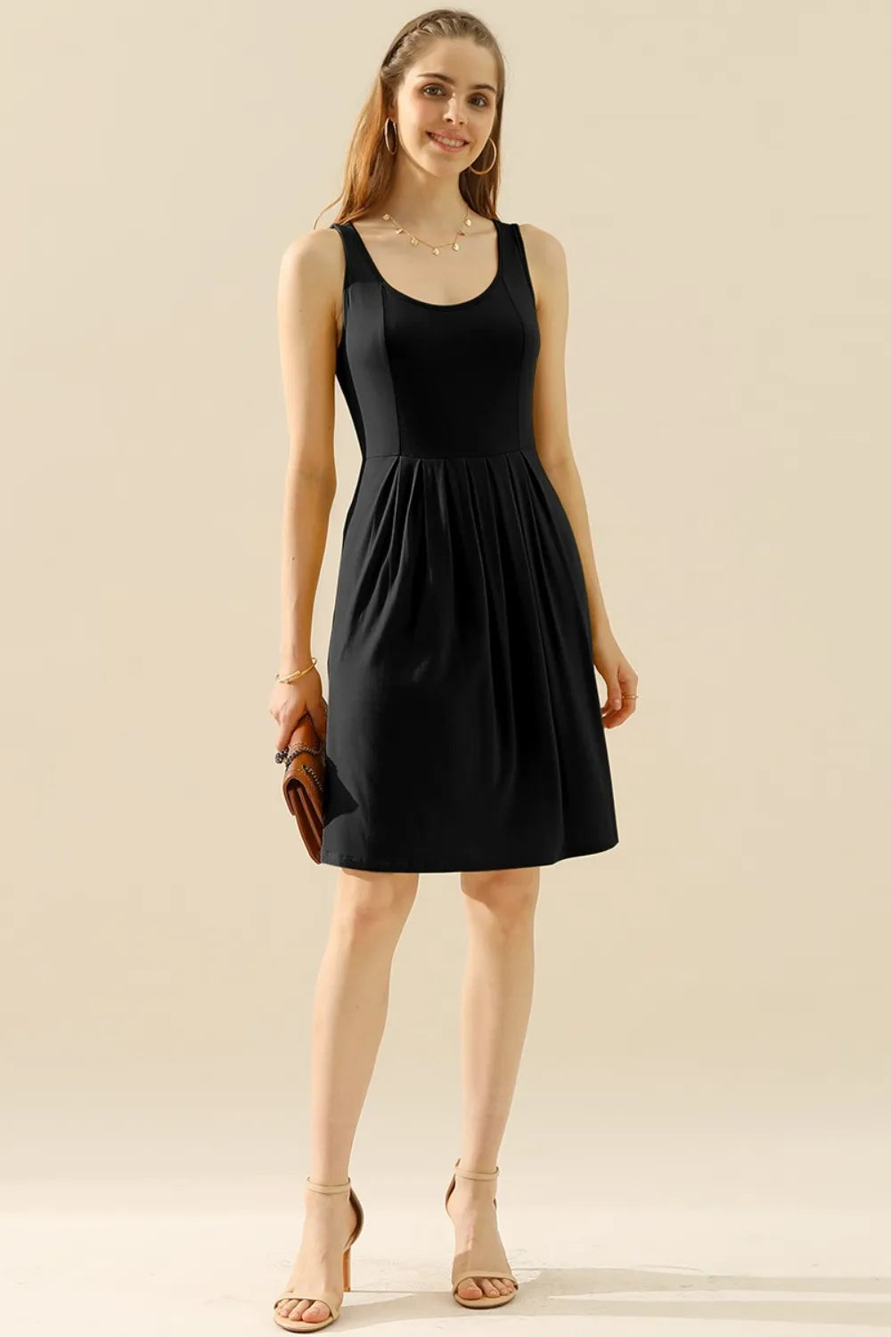 Full Size Round Neck Ruched Sleeveless Dress with Pockets