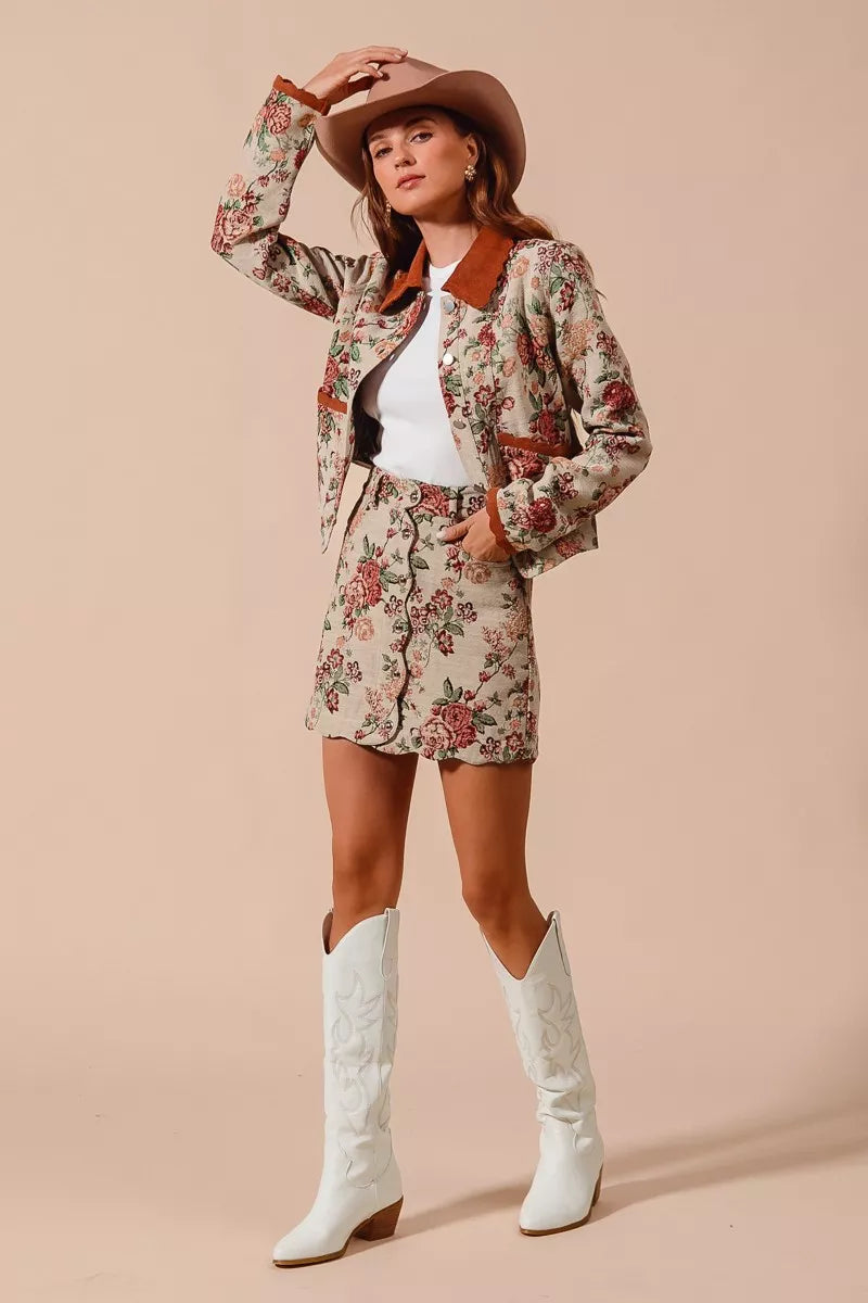 Floral Jacquard Button Front Mini Skirt with Scall