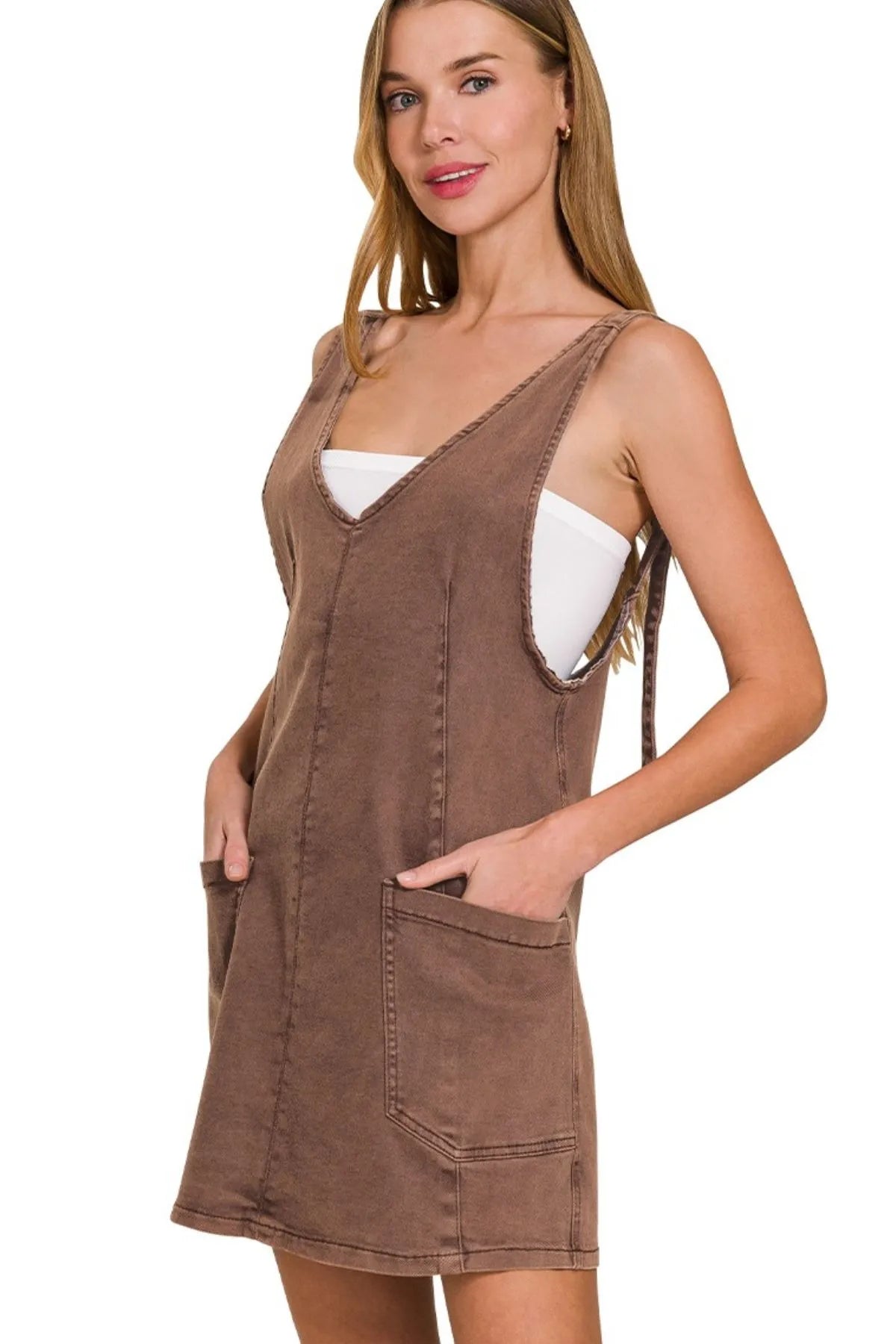 This fashion denim overall dress features a classic V-neck design crafted from high-quality washed denim fabric. The dress showcases a relaxed fit with convenient front pockets, making it both stylish and functional. The versatile brown wash adds a vintage appeal while the sleeveless cut allows for easy layering. Made from durable cotton blend material, this dress combines comfort with style, perfect for casual outings or everyday wear. The above-knee length and loose silhouette create a flattering look suitable for various body types.